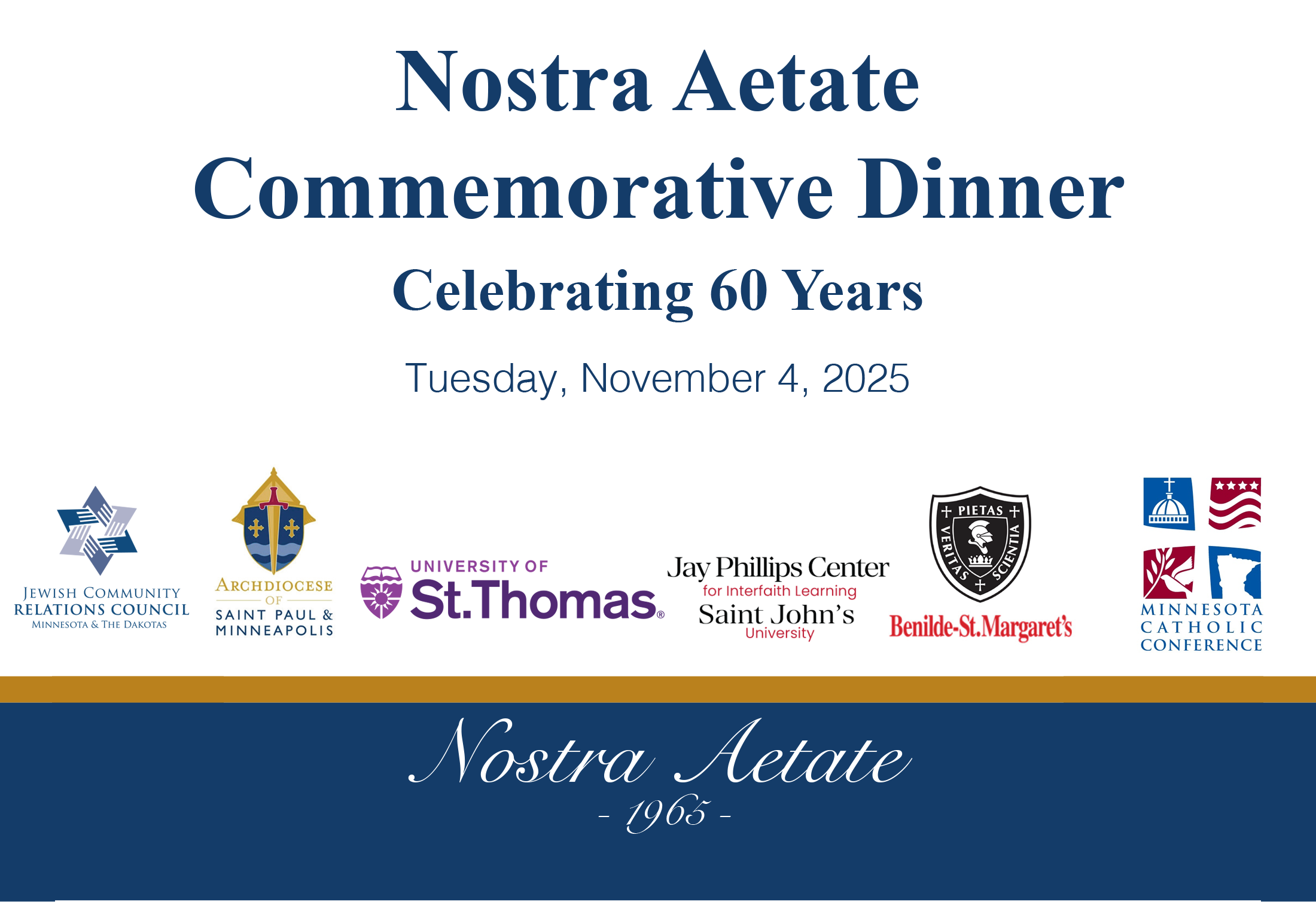 Joining the many worldwide celebrations of the 60th anniversary of Nostra Aetate, and to encourage further solidarity among people of all faiths, the Jewish Community Relations Council of Minnesota and the Dakotas (JCRC) is hosting a community celebration in partnership with the Archdiocese of St. Paul and Minneapolis, the Jay Phillips Center for Interreligious Studies and the Encountering Judaism Initiative (Department of Theology) at the University of St. Thomas, and the Jay Phillips Center for Interfaith Learning at Saint John’s University.