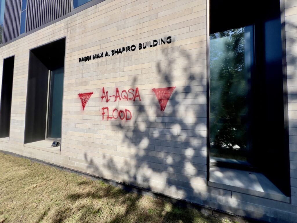 Defacing the synagogue’s education wing, vandals spray-painted threats including “Watch out Zionists,” “F** Zionism,”* and “Al-Aqsa Flood” — Hamas’s code name for the October 7 attacks. They also left 14 inverted red triangles, a symbol which, according to the American Jewish Committee, is “an anti-Israel symbol often weaponized under the guise of ‘Palestinian Resistance’ to identify, harass, and target Israelis and Jews, glorify Hamas’ terror, and call for increased violence against the Jewish people.”